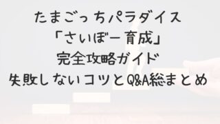 ゲーム たまごっちパラダイス「さいぼー育成」完全攻略ガイド|失敗しないコツとQ&A総まとめ たまごっちパラダイスの中でも特に奥が深い「さいぼー育成」。 見た目はかわいいのに、ゲージ管理を少しでもミスすると全データがリセットされるという、緊張感あふれるモードです。 この記事では、さいぼー育成を成功させるための基礎知識から、失敗を防ぐ... ゲーム